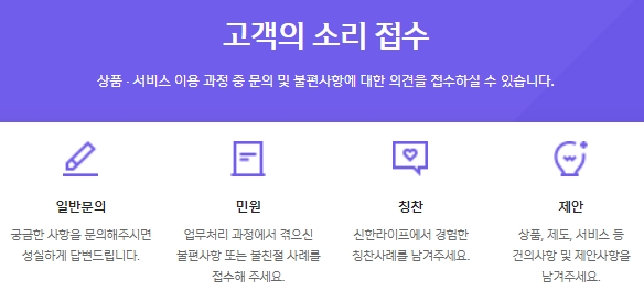 일반문의에서는 궁금한 사항을 문의하시면 성실하게 답변을 해드립니다. 민원에서는 업무처리 과정에서 겪은 불편사항이나 불친절 사례를 접수해주세요. 칭찬에서는 신한라이프에서 경험한 칭찬사례를 남겨주시고,