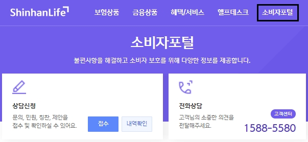 ShinhanLife 또는 신한생명보험 고객센터 전화번호에 대해서 말씀드리겠습니다. 메인화면 상단 우측에 있는 [소비자포털] 메뉴를 선택하셔서 불편사항을 해결할 수 있고, 소비자 보호를 위하여 다양한 정보를 제공합니다.