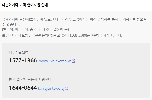 다문화가족 고객 언어지원에 대한 안내도 있는데요, 금융거래에 불편 및 애로사항이 있는 다문화가족 고객은 다누리콜센터와 한국 외국인 노동자 지원센터 연락처를 활용하시면 됩니다. 한국어, 베트남어, 중국어, 태국어, 일본어 등을 지원하고, 언어지원 외 보험업무관련 문의사항은 고객콜센터를 이용하시면 됩니다.