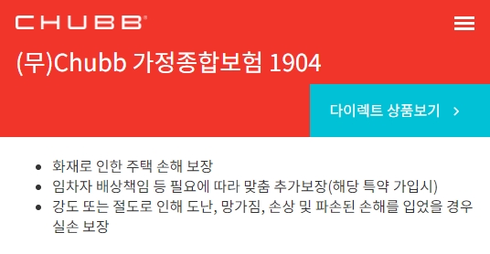 다음은 Chubb 가정종합보험 1904 상품을 보겠습니다. 화재로 인한 주택 손해를 보장하며, 임차자 배상책임 등 필요에 따라서 맞춤 추가보장을 합니다. 강도 또는 절도로 인하여 도난, 망가짐, 손상 및 파손된 손해를 입었을 경우에도 실손보장을 합니다.