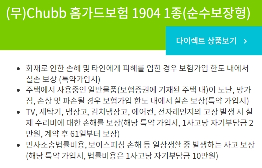 먼저 홈가드보험 1904 1종 순수보장형 상품을 보겠습니다. 특약가입시 화재로 인한 손해 및 타인에게 피해를 입힌 경우 보험가입 한도 내에서 실손 보상을 합니다. 또한 주택에서 사용중인 일반물품이