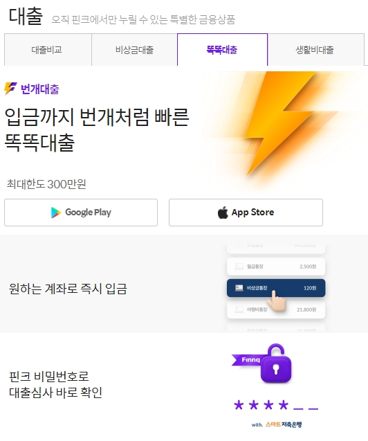오직 핀크에서만 누릴 수 있는 특별한 금융상품이라고 하는데요 비상금, 똑똑, 생활비대출이 있습니다. 똑똑대출은 번개대출이라고도 하며, 입금까지 번개처럼 빠르다고 하네요. 최대한도는 300만원이고, 원하는 계좌로 즉시입금이 가능하며, 핀크 비밀번호로 대출심사를 바로 확인할 수 있습니다.