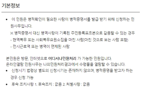 현역복무 또는 사회복무요원소집을 마친사람이나 전시근로역 또는 병역이 면제된 사람은 병적증명서 대신 병역사항이 기록된 주민등록표초본으로 갈음할 수 있습니다. 해당민원은 방문이나 인터넷으로 어디서나 처리가 가능한 민원이며, 온라인열람 민원사무는 나의민원처리결과에서 수령물을 열람할 수 있어요.