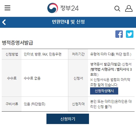 구비서류가 필요하고, 신청자격은 본인 또는 대리인이지만 온라인으로는 대리인 신청이 불가합니다. 해당 민원은 병적확인이 필요한 사람이 병적증명서를 발급받기 위하여 신청하는 민원사무입니다.