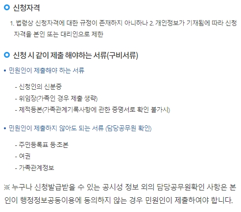 신청자격은 법령상 신청자격에 대한 규정이 존재하지 않으나 개인정보가 기재됨에 따라 신청자격을 본인 또는 대리인으로 제한합니다. 신청시 민원인이 제출해야 하는 서류는 신청인의 신분증, 위임장, 재적등본이며 경우에 따라서 일부가 생략될 수 있습니다. 민원인이 제출하지 않아도 되는 서류는 담당공무원이 확인하며 주민등록표 등/초본, 여권, 가족관계정보가 있습니다.