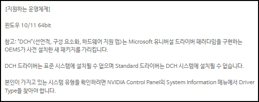 DHC 드라이버는 표준 시스템에 설치될 수 있으며, 스탠다드 드라이버는 DHC 시스템에 설치될 수 없습니다. 본인이 갖고있는 시스템 유형을 확인하려면 엔비디아 컨트롤 패널의 인포메이션 메뉴에서 드라이버 타입을 찾아야 합니다.