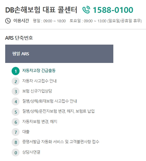 ARS 단축번호는 1번부터 8번까지 각각 자동차고장 긴급출동, 자동차 사고접수 안내, 보험 신규가입상담, 질병/상해/화재보험 사고접수 안내, 질병/상해/운전자보험 변경/해지/보험료 납입, 자동차보험 변경/해지, 대출, 증명서발급 자동화 서비스 및 고객불편사항 접수이고 0번을 누르시면 상담사와 연결됩니다.