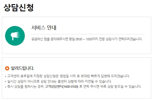 상담신청은 궁금하신 점을 문의하시면 09시~18시까지 전문상담사가 연락드립니다. 고객센터 휴무일에 지정된 상담신청은 영업일 시작후 최대한 빠르게 답변해드리며, 실시간 상담이 아니기때문에 상담안내는 콜센터 상황에 따라서 지연될 수 있습니다. 즉시상담을 원하시면 고객상담센터로 연락하여 바로 상담받으실 수 있습니다.