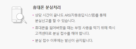 상담시간이 종료되어도 자동응답시스템인 ARS를 통하여 분실신고를 할 수 있습니다. 휴대폰을 분실했을때에는 부정사용을 방지하기 위해서 즉시 고객센터로 분실접수를 해야합니다. 분실접수 이후에는 발신이 금지됩니다.