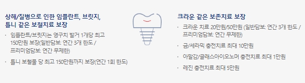 상품의 보장내용을 보시면 먼저 상해/질병으로 인한 임플란트/브릿지는 영구치 발거 1개당 최고 150만원을 보장하고, 틀니 보철물당 최고 150만원까지 보장합니다. 크라운 치료는 20만원/50만원, 금/세라믹 충전치료는 최대 10만원, 아말감/글래스아이오노머 충전치료는 최대 1만원, 레진 충전치료는 최대 5만원을 보장합니다. 눈, 귀, 코와 관련된 특정질병 수술비도 보장하는데요