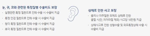 실명관련 특정질환으로 인하여 수술시, 특정 안검질환으로 인한 수술시, 청각 특정질환으로 인한 수술시, 후각 특정질환으로 인한 수술시 수술비를 지급합니다.