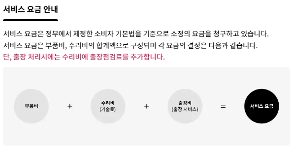 서비스 요금은 정부에서 정한 소비자 기본법을 기준으로 청구하고 있으며, 부품비와 수리비의 합계액으로 청구되고, 출장 처리시에는 수리비에 출장점검료가 추가됩니다. (서비스요금 = 부품비 + 수리비 + 출장비)
