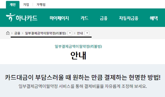 하나카드 홈페이지에 접속하셔서 금융, 일부결제금액이월약정(리볼빙), 안내 메뉴순으로 들어가시면 되는데요 카드대금이 부담스러울때 원하는만큼 결제하는 방식입니다. 해당 서비스를 통하여 결제비율을 자유롭게 조정할 수 있습니다.