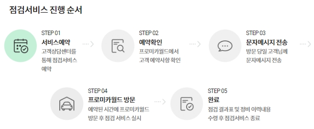 점검서비스 진행순서는 다섯가지 과정으로 진행됩니다. 첫번째는 고객상담센터를 통한 점검서비스 예약, 두번째는 프로미카월드에서 고객 예약사항 확인, 세번째는 방문 당일 고객에게 문자메시지 전송, 네번째는 예약된 시간에 프로미카월드 방문 후 점검 서비스 실시, 다섯번째는점검 결과표 및 정비 이력내욕 수령 후 점검서비스 종료입니다.