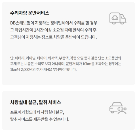 DB손해보험이 지정하는 정비업체에서 수리할 경우 작업시간이 1시간 이상 소요될 때에 한해서 수리 후 고객이 지정하는 장소로 차량을 운반해드립니다.