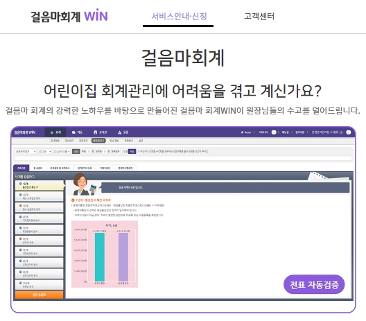 회계전문 컨설턴트가 원장님과 함께하며, 정확한 어린이집 운영상태 현황분석을 통한 맞춤형 컨설팅을 제공합니다. 걸음마 단계별 검증시스템을 통한 어린이집의 예산, 추경, 결산 컨설틴이며 20여년의 걸음마 노하우로 시설 운영현황과 예/결산서 및 정보공시 내용의 일치를 실현할 수 있습니다. 서비스 비용문의는 고객센터에서 하실 수 있으며, 전화번호는 1544-6953번이고, 운영시간은 평일 09시~18시 및 점심시간 12시~13시까지입니다.
