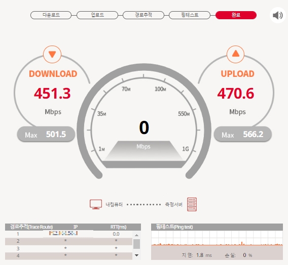 다운로드와 업로드 속도 그리고 UDP 지연 및 손실에 대하여 최대, 평균, 최소, 편차정보를 보여줍니다. 또한 경로추적 결과에서는 아이피주소와 RTT정보를 보여주네요. RTT는 Round Trip Time이라고 하여 패킷 왕복시간을 뜻합니다.