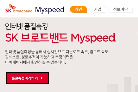SK broadban Myspeed 홈페이지에 접속해서 SK 인터넷 속도측정 또는 인터넷 품질측정을 해보도록 하겠습니다. 품질측정은 TTA 인증을 받은 소프트웨어를 사용하며, 보다 정확한 측정을 위해서 측정PC의 하드웨어 사양에 의한 영향을 최소화하고, PC의 하드디스크 액세스 등을 배제한 순수한 TCP/IP 레이어에서의 성능을 확인합니다.