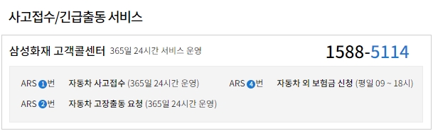 고객콜센터 번호인 1588-5114번으로 연락하면 ARS 1번이 자동차 사고접수, ARS 2번이 자동차 고장출동 요청, ARS 4번이 자동차 외 보험금 신청입니다.