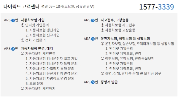 이외에도 다이렉트 보험상담은 1577-3339번, 자동차보험 전화가입은 1600-5008번, 해외거주 고객전용은 82-2-2119-2000번, 수신거부 전화는 080-679-0001번, 청각장애인 전용은 070-7451-9800/9810번입니다.