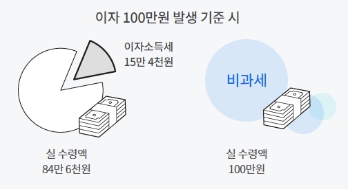 관련세법을 충족하고, 5년납 및 10년이상 계약 유지시에는 비과세 혜택으로 이자소득세 15.4%가 면제됩니다. 예를들어서 이자가 100만원 발생했다고 가정하면, 소득세를 적용했을때 실수령액이 84만6천원이 되는데 비과세를 적용하면 실수령액이 100만원이 됩니다.