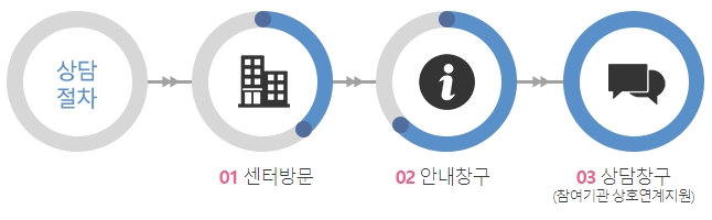 또한 법원의 개인회생, 개인파산 연계지원, 맞춤대출, 고금리전환, 휴면예금 조회와 지급, 신용정보조회 및 진단 등을 포괄적으로 상담할 수 있습니다. 그리고 지자체 및 고용복지부 등과 연계해서 일자리상담, 취업안내, 복지서비스를 제공합니다. 상담절차는 아래 그림과 같습니다.