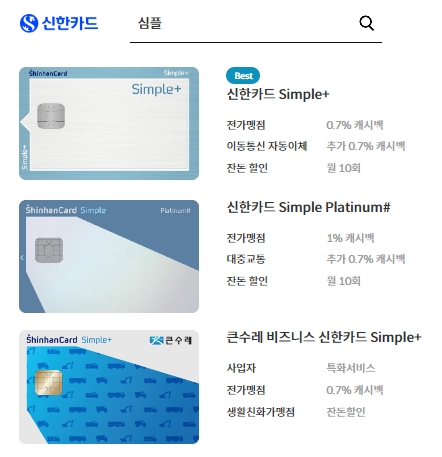 신한카드 홈페이지에 접속해서 [심플] 정도로 키워드를 잡고 검색하시면 몇 가지 상품들을 확인할 수 있습니다. 오늘은 신한 심플카드 상품중에 하나인 심플플러스카드 혜택에 대해서 알아보려고 하는데요, 크게 세가지로 구분하여 안내하고 있습니다.