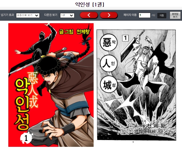 넘기기 효과는 수동으로 보기, 자동 3초/5초/10초/15초/20초 중에서 선택할 수 있습니다. 다른권 보기에서는 원하는 권을 선택할 수 있으며, 좌우를 가리키는 화살표 모양 버튼을 눌러서 책장을 앞뒤로 넘길 수 있어요. 페이지 이동에서는 원하는 페이지로 한번에 이동할 수 있고 [뷰어창 보기] 버튼을 누르시면 새창으로 열린 상태에서 만화를 볼 수 있습니다.
