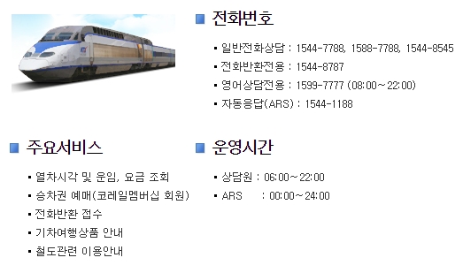 제공하는 주요서비스는 열차시각과 운임 및 요금조회, 승차권 예매, 전화반환 접수, 기차여행 상품안내, 철도관련 이용안내를 합니다. 운영시간은 상담원의 경우 06시부터 22시까지, ARS의 경우 00시부터 24시까지, 영어상담전용의 경우 08시부터 22시까지입니다.