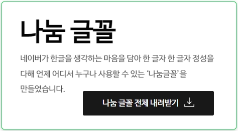 네이버가 한글을 생각하는 마음을 담아 한 글자 한 글자 정성을 다하여 언제 어디서 누구나 사용할 수 있는 나눔글꼴을 만들었다고 합니다. [나눔 글꼴 전체 내려받기] 버튼을 눌러서 한번에 다운로드가 가능합니다.