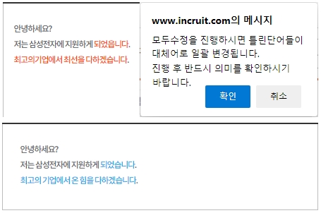 그럼 저도 임의로 문장을 간단하게 입력해보겠습니다. 일부러 몇군데 틀리게 작성해보았는데요 [모두수정] 버튼을 누르면 일괄적으로 수정할 수 있고, 진행 후에는 반드시 의미를 확인하시기 바랍니다. 기존에 틀렸던 부분은 붉은색으로 표시되며, 수정된 부분은 파란색으로 표시됩니다.