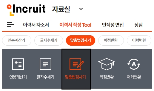인크루트 홈페이지로 들어가서 [자료실] 메뉴를 선택하고 [이력서 작성 Tool] 항목으로 들어갑니다. 그리고 [맞춤법검사기] 항목을 선택하시면 되겠습니다. 이외에도 연봉계산기, 글자수세기, 학점변환, 어학변환 툴들도 있으니 같이 참고해보세요.