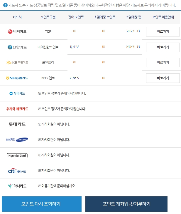 위임장은 카드포인트 통합조회 및 포인트 계좌입금 신청을 한 경우 그 신청목적 용도로만 사용됩니다. 조회결과는 아래와 같이 총 11개 카드사의 정보를 보여주는데요, 지원하지 않는 카드사의 경우 직접 계좌입금 신청을 하셔야 합니다.