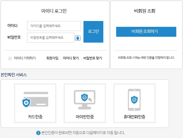 저는 비회원으로 조회해보았는데요, 비회원 조회시에는 매번 인증을 진행해야 합니다. 인증수단은 카드, 아이핀, 휴대전화가 있으며 본인인증이 완료되면 자동으로 다음페이지로 이동됩니다. 카드포인트 통합조회/계좌입금 서비스 이용을 위해서는 위임절차에 동의해야 합니다.