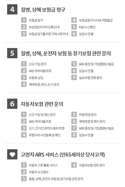 만65세 이상 당사고객은 고령자 ARS 서비스를 이용할 수 있으며, 1번은 자동차 고장출동 서비스 / 2번은 자동차 사고접수 / 3번은 질병과 상해 및 운전자보험 등 장기보험 관련문의 / 4번은 자동차보험 관련문의입니다.