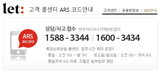 롯데손해보험 고객센터 또는 콜센터 전화번호와 ARS코드에 대한 안내를 드리겠습니다. 해당 보험사 홈페이지에 접속해서 메인화면 상단의 [고객센터] 메뉴를 선택하고 [유용한정보] 영역의 [ARS안내] 항목으로 들어갑니다. 상담 및 사고접수는 전국 어디서나 지역번호 없이 1588-3344번 또는 1600-3434번으로 하시면 됩니다.