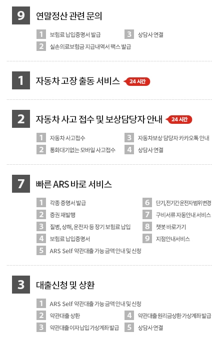 ARS 9번은 연말정산 관련문의이고, 다시 1번은 보험료 납입증명서 발급 / 2번은 실손의료보험금 지급내역서 팩스발급 / 3번은 상담사 연결입니다. ARS 1번은 자동차 고장출동 서비스입니다.