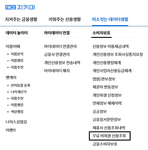 홈페이지에 접속해서 [미소짓는 데이터생활] 메뉴의 [소비자보호] 영역에서 [무료 비회원 신용조회] 항목을 선택합니다. 신용점수를 확인하더라도 신용점수에 영향을 미치지 않으며, 자신의 신용점수에 대한 이의제기도 가능합니다.