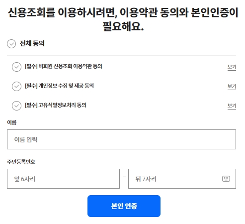 신용조회를 위해서는 이용약관 동의와 본인인증이 필요합니다. 모두 동의 후 이름과 주민등록번호를 입력하여 [본인인증] 버튼을 누르시면 휴대폰 본인인증 후 신용조회가 가능합니다. 해당 서비스 이용과 관련해서 궁금하거나 문의할 사항이 있으시면 고객센터 1588-2486번으로 연락해보세요.