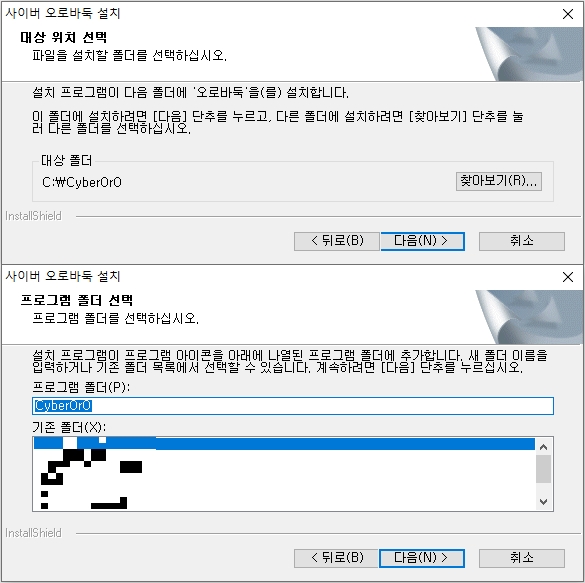 설치파일을 실행하여 인스톨 작업을 진행할 수 있습니다. 설치 프로그램이 대상폴더에 오로바둑을 설치하는데요, 기본위치는 C드라이브입니다. [찾아보기] 버튼을 눌러서 여러분들이 임의로 다른폴더를 지정할 수 있습니다.