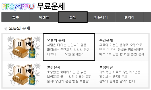 하지만 이외에도 여러가지 정보들을 제공하고 있는데요, 오늘은 그중에서 뽐뿌 무료운세를 이용해보도록 하겠습니다. 오늘의 운세 카테고리에서는 오늘, 주간, 월간운세 및 토정비결을 볼 수 있습니다.