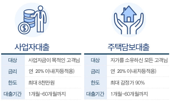 사업자대출 대상은 개인, 법인사업자, 자영업자 등 사업자금이 목적인 고객입니다. 금리는 연 20%이내, 한도는 100만원부터 8000만원까지, 기간은 1개월~60개월, 상환은 원리금균등분할상환, 취급수수료는 없습니다. 주택담보대출 대상은 아파트, 주택, 빌라 등을 소유 또는 담보제공가능한 고객 및 기존에 대출을 이용했지만 추가대출이 필요한 고객입니다. 한도는 1천만원~감정가90%, 상환은 원리금균등분할/만기일시/중도상환이 가능합니다. 금리, 기간, 수수료 정보는 좀전의 상품과 동일합니다.