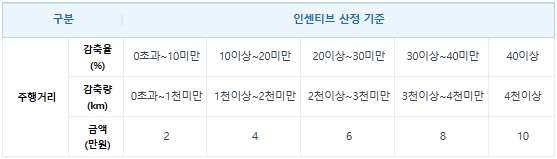 인센티브 산정기준 표를 통해서는 주행거리 감축율과 감축량에 따른 금액을 확인할 수 있습니다. 주행거리 인센티브는 감축률, 감축량 중 유리한 실적으로 적용됩니다. 관심 있으신 분들은 오늘 말씀드린 내용을 참고하여 인센티브를 최대 10만원까지 받아보시기 바랍니다.