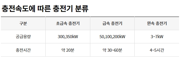 충전속도에 따른 충전기 분류 정보는 위의 표를 참고하세요.
