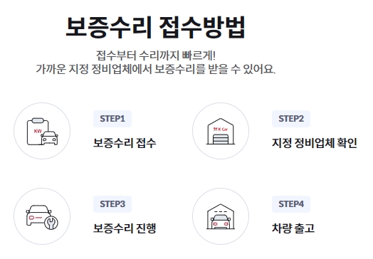 케이카 워런티에 가입했다면 전화나 온라인으로 내용을 접수할 수 있고, 케이카 전문 상담원이 가장 가까운 지정 정비소를 안내드립니다. 지정 정비소에서 차량의 문제를 파악하고 수리해드리며, 차량수리 완료 후 출고됩니다.