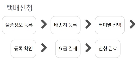 개인회원, 법인회원, 비회원 로그인 후 택배신청 메뉴에서 택배를 신청할 수 있습니다. 절차는 물품정보등록 > 배송지등록 > 터미널선택 > 등록확인 > 요금결제 > 신청완료 순입니다.