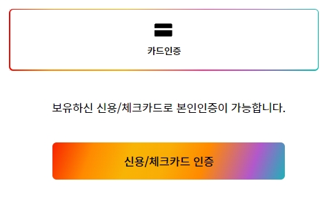 보유하고 있는 신용/체크카드로 본인인증을 진행할 수 있으며 [신용/체크카드 인증] 버튼을 눌러주시면 됩니다. 반드시 본인명의의 체크카드 또는 신용카드로만 인증을 해야하고, 카드사에 등록된 휴대폰번호만 입력하셔야 합니다.