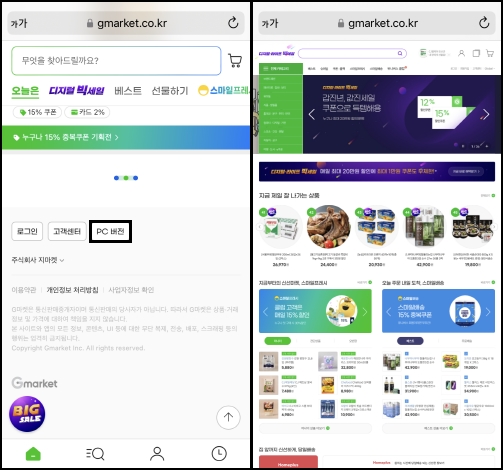 하지만 메인화면에서 제공하는 상품들이 워낙 많아서 스크롤을 맨 하단까지 내리기가 좀 번거로울 수 있는데요, 모바일에서의 PC버전 바로가기 페이지(https://www.gmarket.co.kr/?sL=MW)를 참고하시면 곧바로 접속할 수 있습니다.