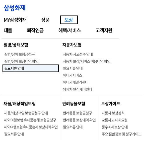 삼성화재 홈페이지에 접속하여 보상 > 질병/상해보험 > 필요서류 안내 메뉴 순으로 들어가시면, 질병/상해 보험금 청구에 필요한 서류들을 확인할 수 있습니다. 오늘은 그중에서 삼성화재 실비보험 청구서류(실손의료비)에는 어떠한 것들이 있는지 알아보려고 합니다.