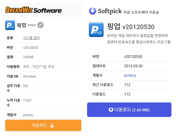 두 사이트 모두 동일한 버전의 파일을 제공하고 있기때문에 여러분들이 원하는 페이지를 선택하시면 될 것 같습니다. 핑업은 온라인 게임 네트워크 설정값을 변경하여 컴퓨터 반응속도를 향상시켜주는 프로그램입니다.